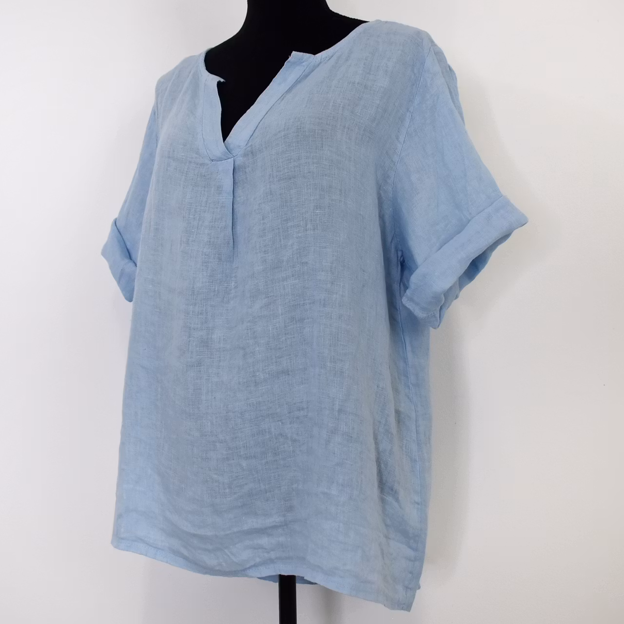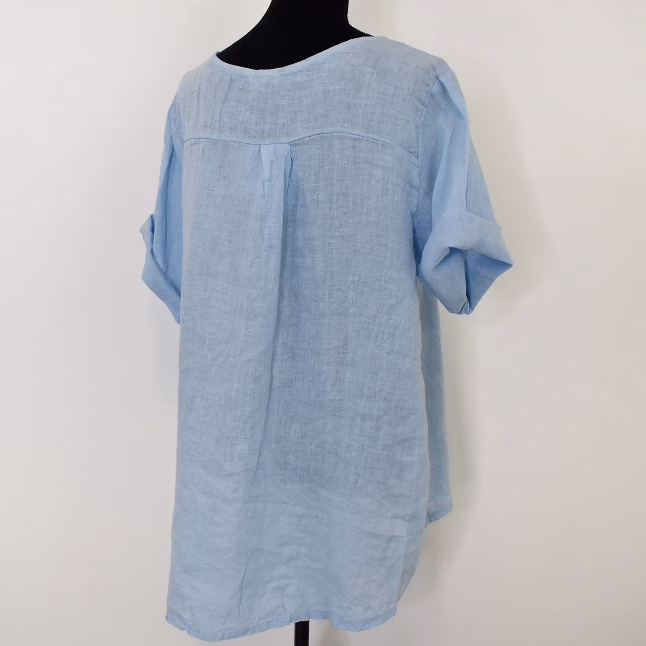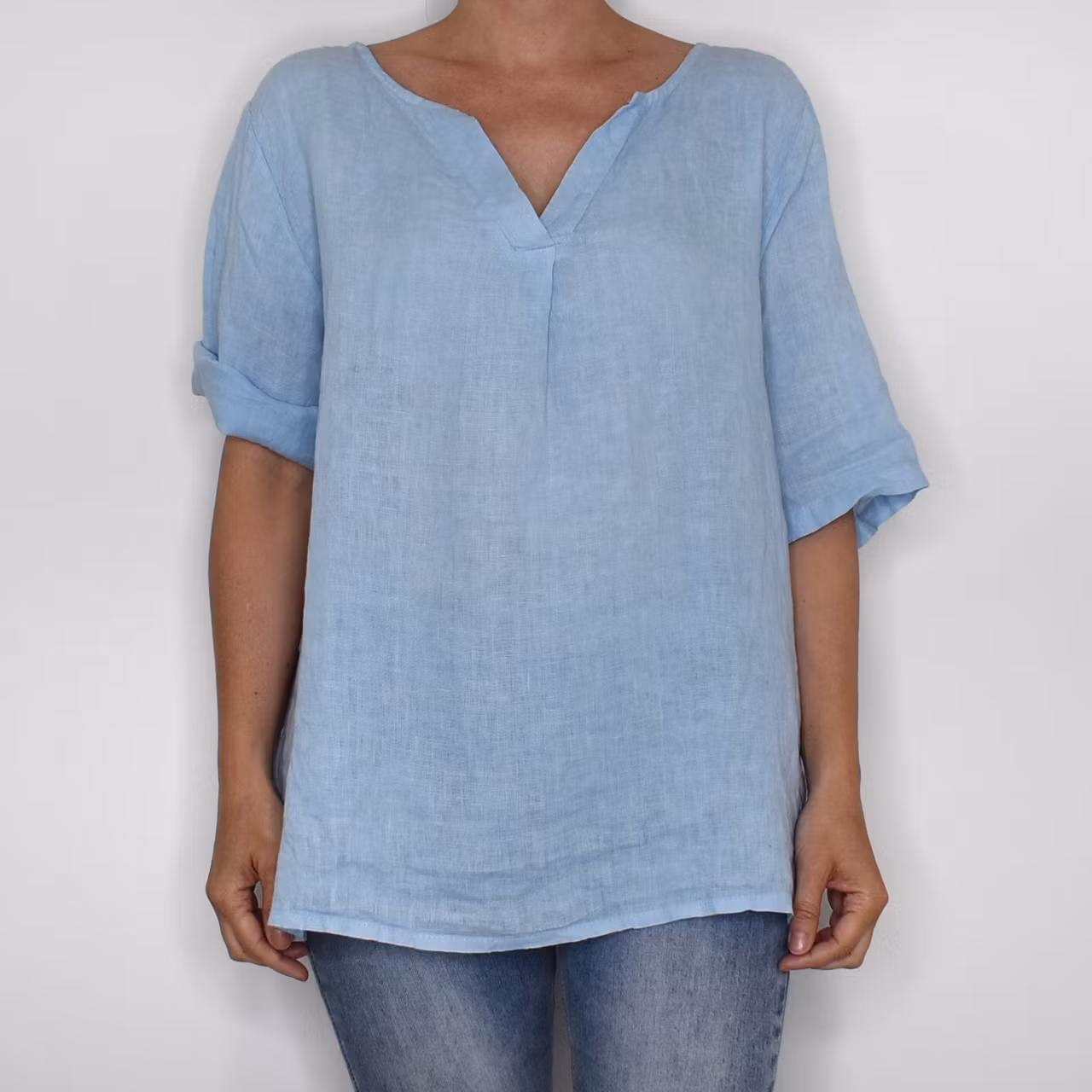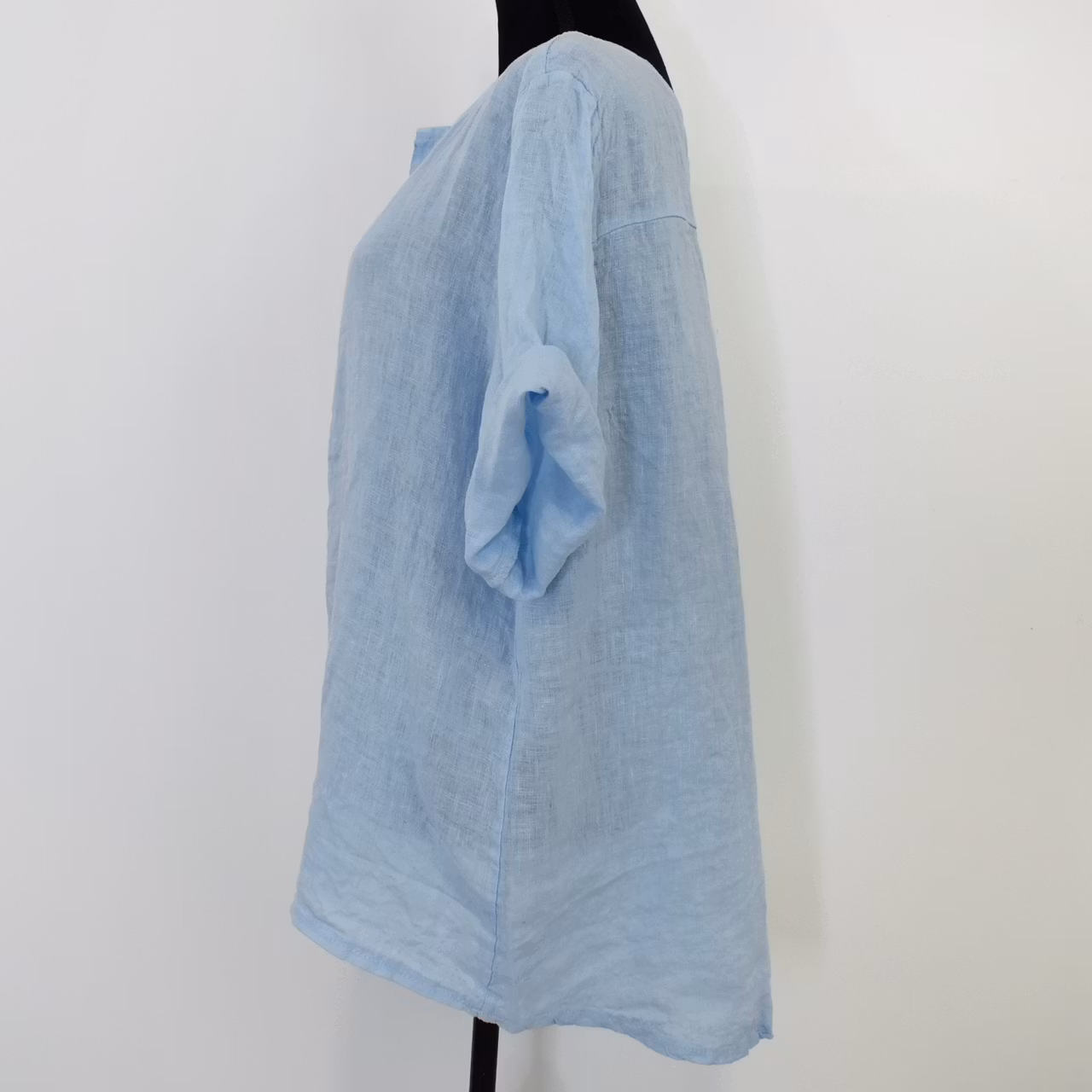 Det här är en enkel och fin v-ringad topp i tunt linnetyg. Ärmen är halvlång och kan vikas upp. På ryggen är där ett dekorativt sprund och toppen är längre baktill. Observera att materialet inte innehåller stretch och att tyget är tunt och något genomskinligt. One Size - passar uppskattningsvis upp till 40/42. Då vi alla är olika formade är det viktigt att alltid ta hjälp av mått-tabellen för att köpet ska bli lyckat. Modellen har en bröstvidd på cirka 88cm och är 163cm lång. Observera att förekomsten av streck, färgskiftningar etc. inte är defekter utan en del av det som gör tyget vackert.