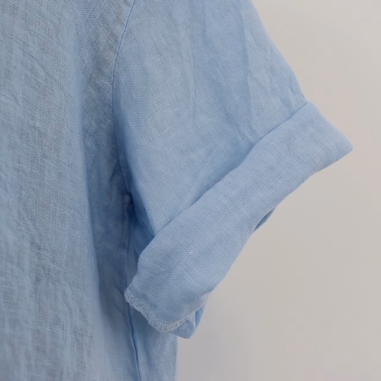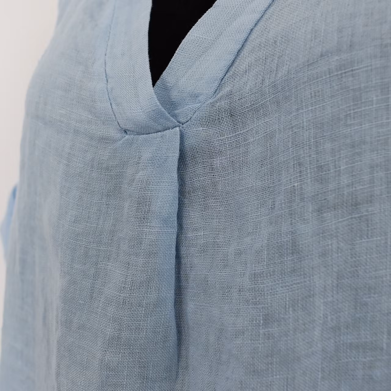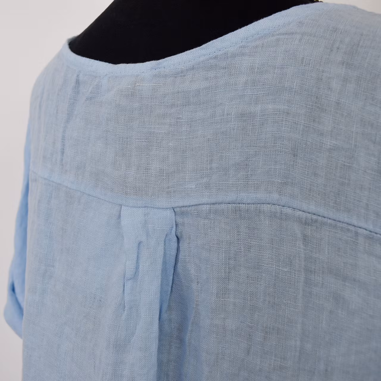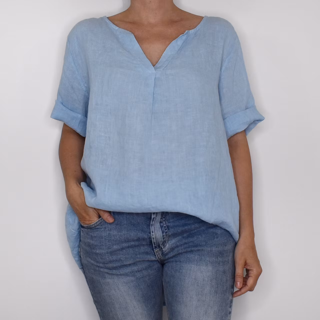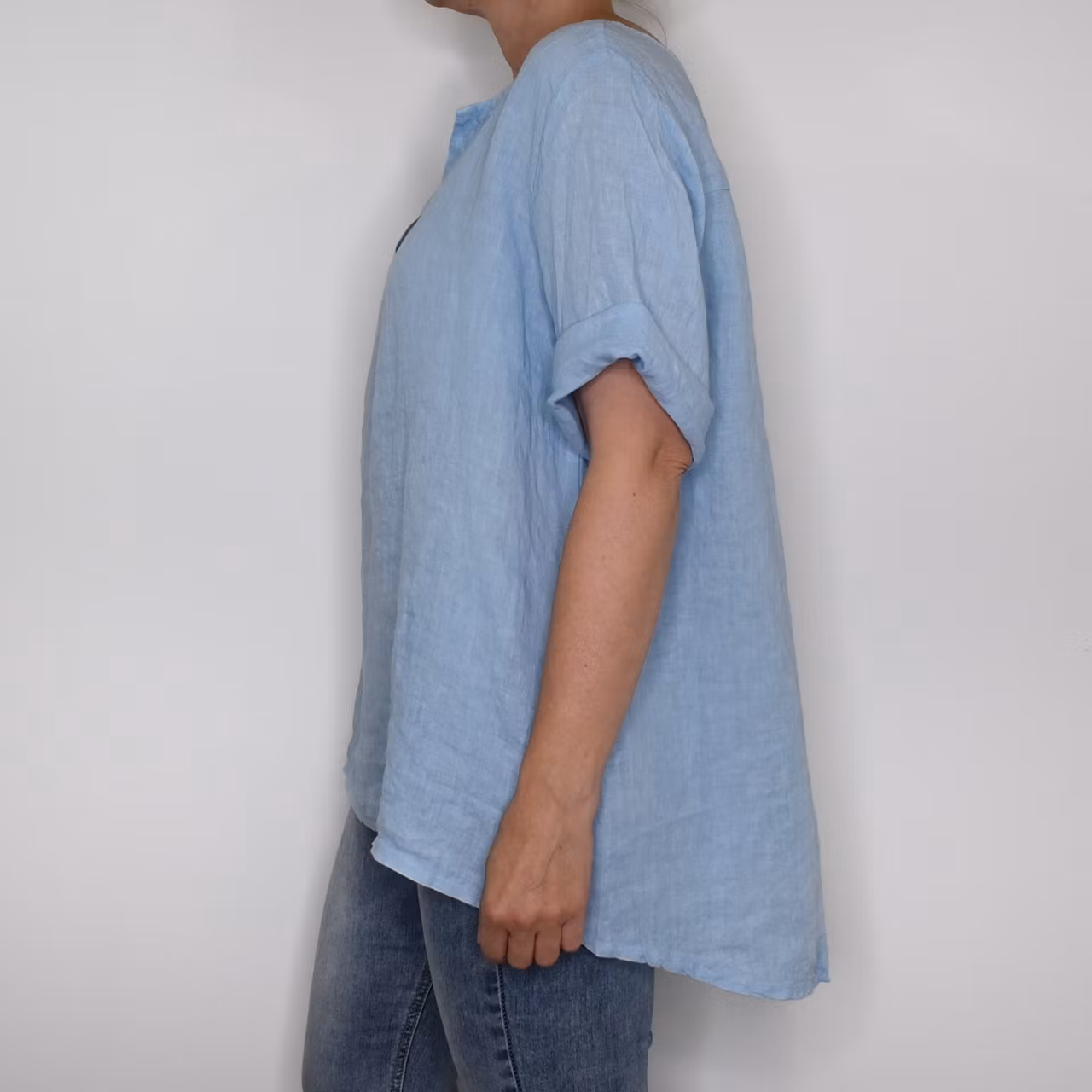 Det här är en enkel och fin v-ringad topp i tunt linnetyg. Ärmen är halvlång och kan vikas upp. På ryggen är där ett dekorativt sprund och toppen är längre baktill. Observera att materialet inte innehåller stretch och att tyget är tunt och något genomskinligt. One Size - passar uppskattningsvis upp till 40/42. Då vi alla är olika formade är det viktigt att alltid ta hjälp av mått-tabellen för att köpet ska bli lyckat. Modellen har en bröstvidd på cirka 88cm och är 163cm lång. Observera att förekomsten av streck, färgskiftningar etc. inte är defekter utan en del av det som gör tyget vackert.