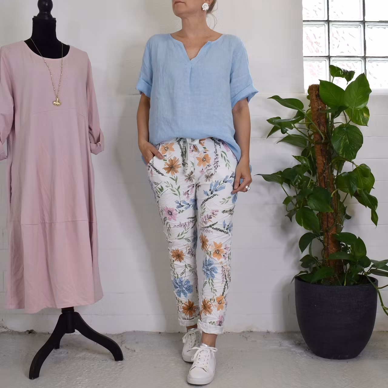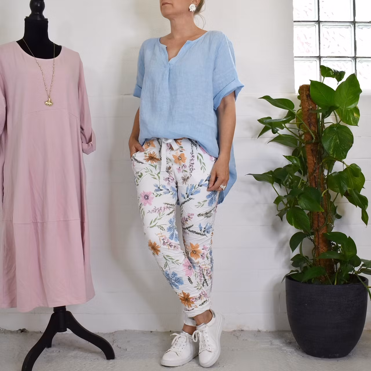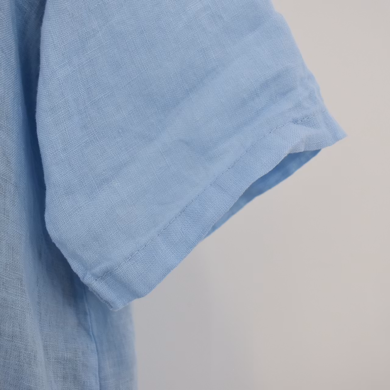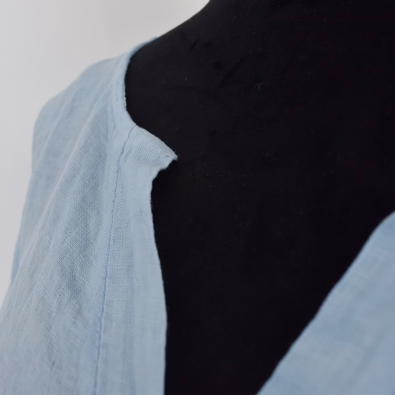 Det här är en enkel och fin v-ringad topp i tunt linnetyg. Ärmen är halvlång och kan vikas upp. På ryggen är där ett dekorativt sprund och toppen är längre baktill. Observera att materialet inte innehåller stretch och att tyget är tunt och något genomskinligt. One Size - passar uppskattningsvis upp till 40/42. Då vi alla är olika formade är det viktigt att alltid ta hjälp av mått-tabellen för att köpet ska bli lyckat. Modellen har en bröstvidd på cirka 88cm och är 163cm lång. Observera att förekomsten av streck, färgskiftningar etc. inte är defekter utan en del av det som gör tyget vackert.