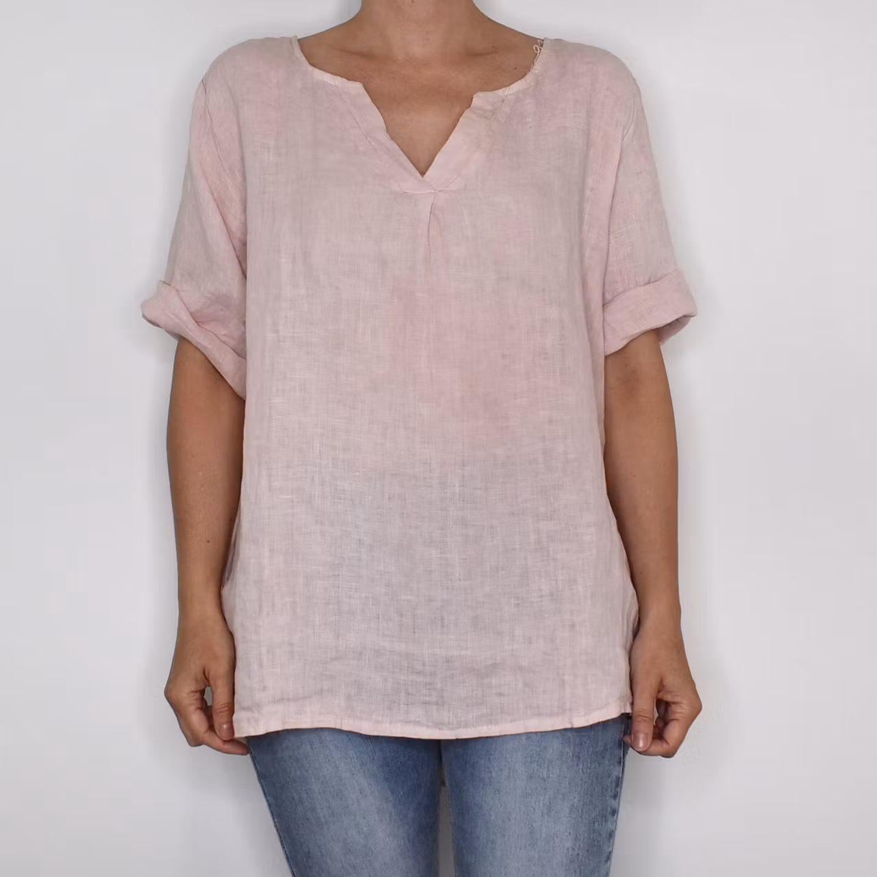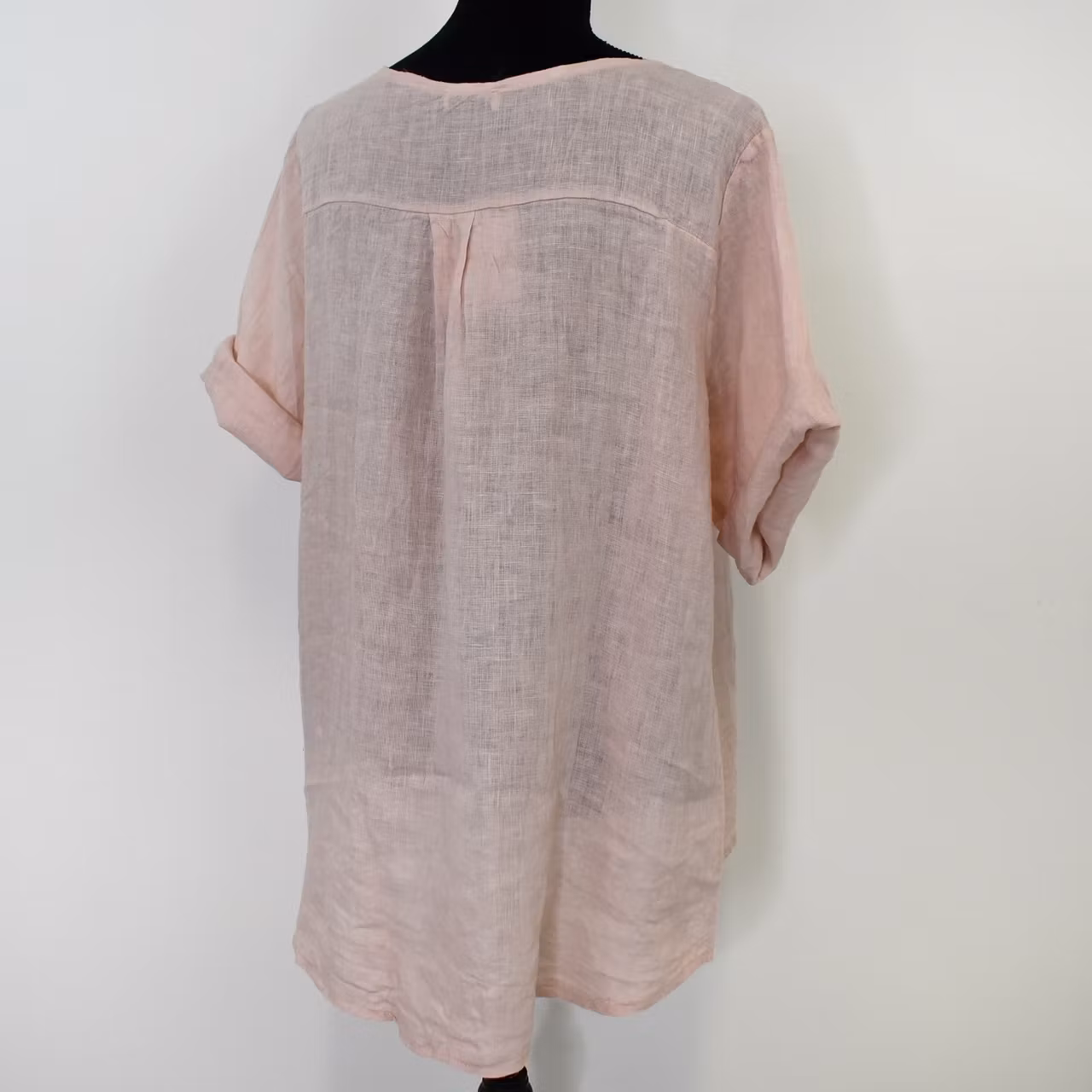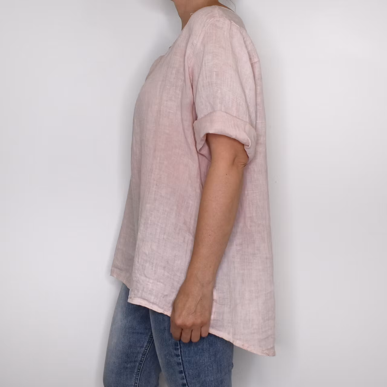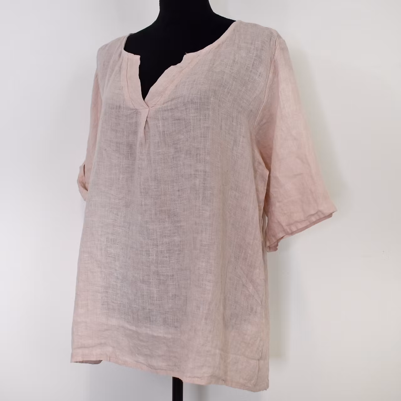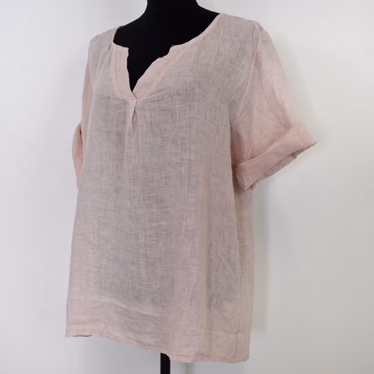 Det här är en enkel och fin v-ringad topp i tunt linnetyg. Ärmen är halvlång och kan vikas upp. På ryggen är där ett dekorativt sprund och toppen är längre baktill. Observera att materialet inte innehåller stretch och att tyget är tunt och något genomskinligt. One Size - passar uppskattningsvis upp till 40/42. Då vi alla är olika formade är det viktigt att alltid ta hjälp av mått-tabellen för att köpet ska bli lyckat. Modellen har en bröstvidd på cirka 88cm och är 163cm lång. Observera att förekomsten av streck, färgskiftningar etc. inte är defekter utan en del av det som gör tyget vackert.