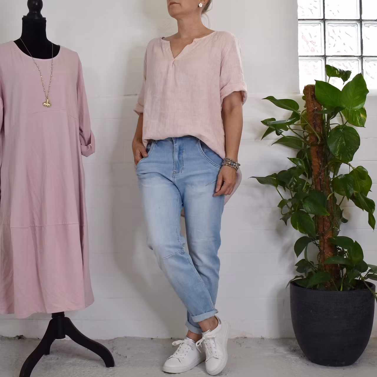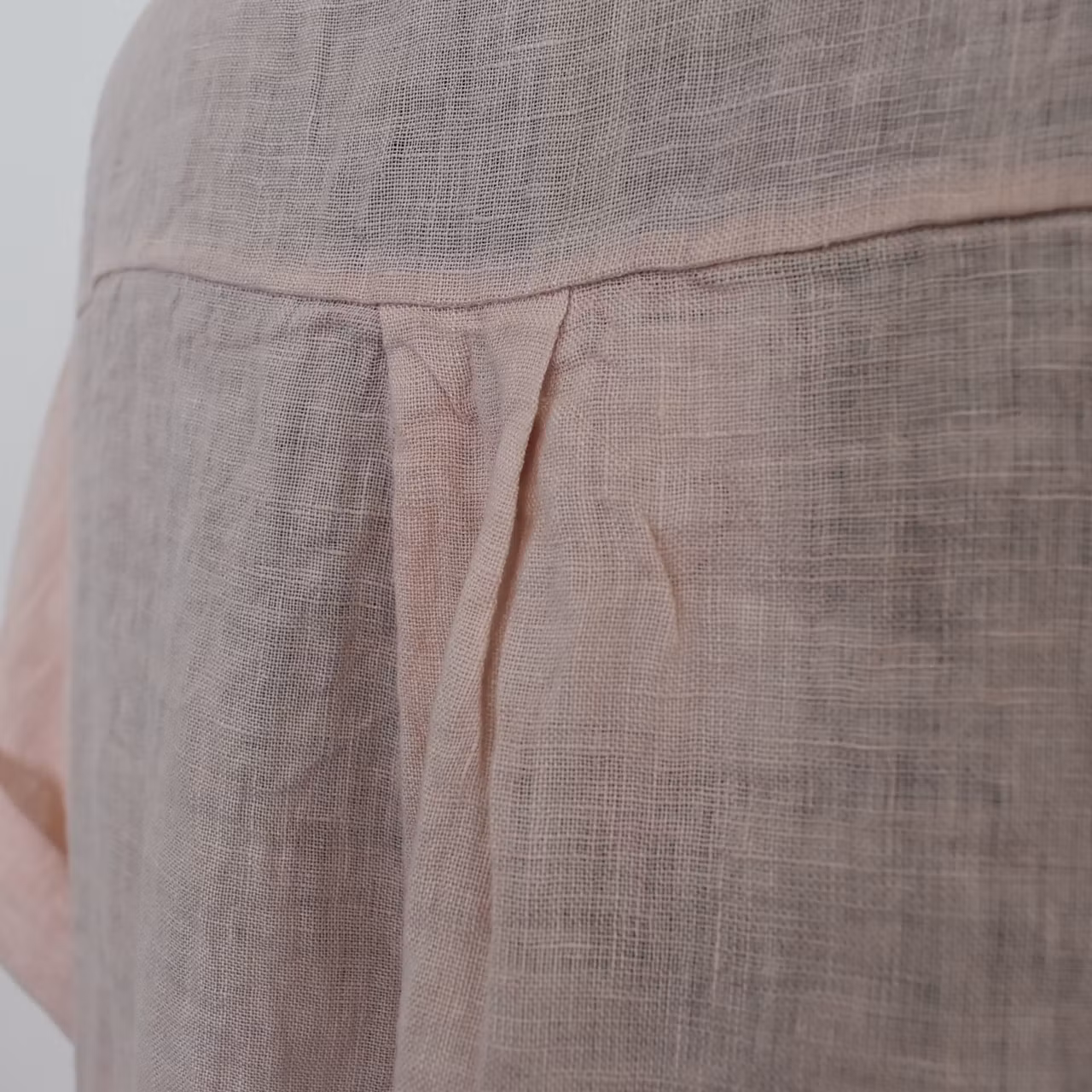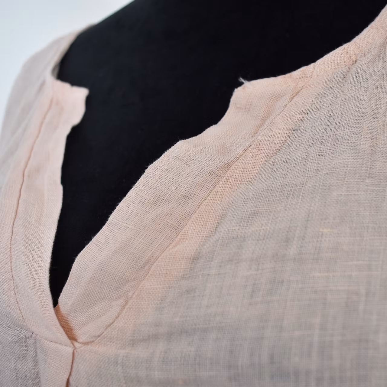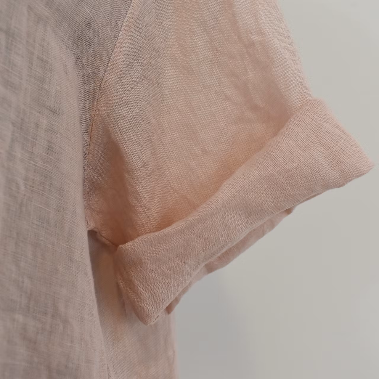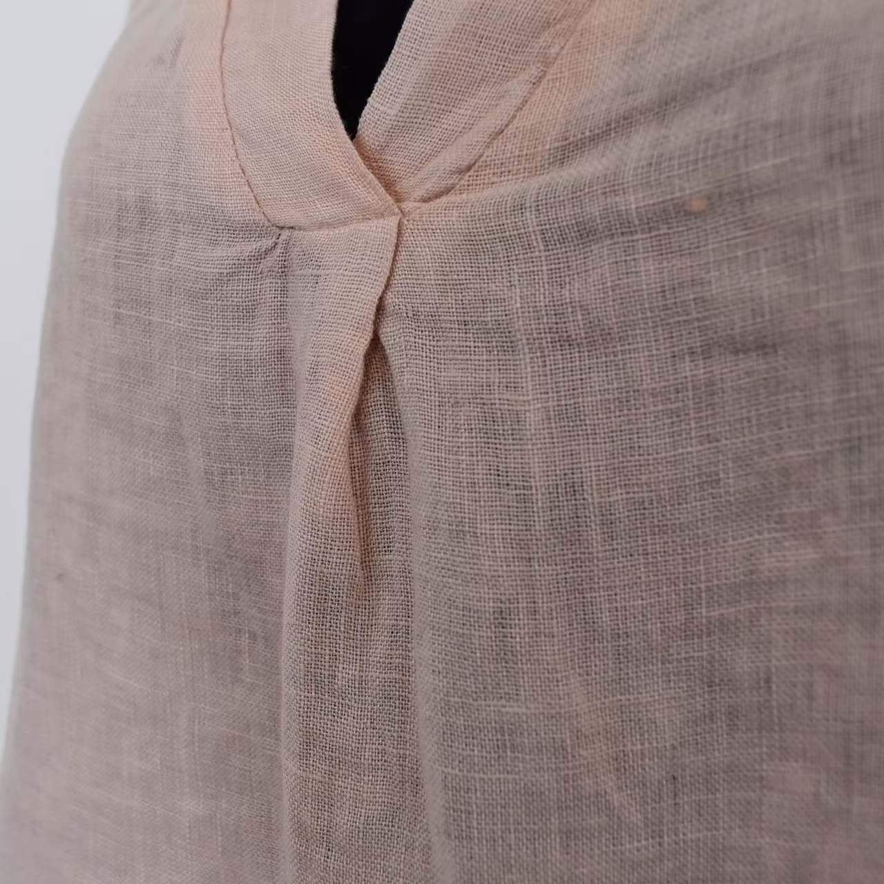 Det här är en enkel och fin v-ringad topp i tunt linnetyg. Ärmen är halvlång och kan vikas upp. På ryggen är där ett dekorativt sprund och toppen är längre baktill. Observera att materialet inte innehåller stretch och att tyget är tunt och något genomskinligt. One Size - passar uppskattningsvis upp till 40/42. Då vi alla är olika formade är det viktigt att alltid ta hjälp av mått-tabellen för att köpet ska bli lyckat. Modellen har en bröstvidd på cirka 88cm och är 163cm lång. Observera att förekomsten av streck, färgskiftningar etc. inte är defekter utan en del av det som gör tyget vackert.