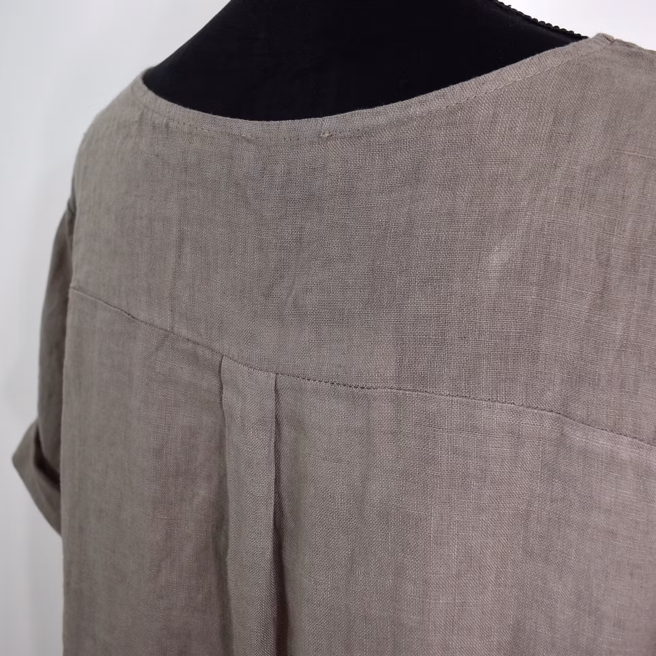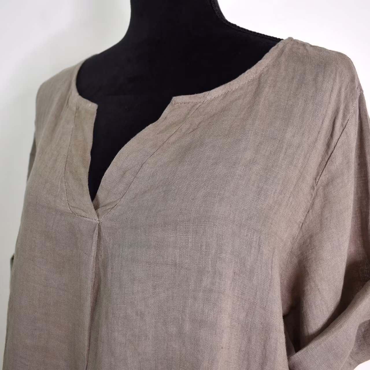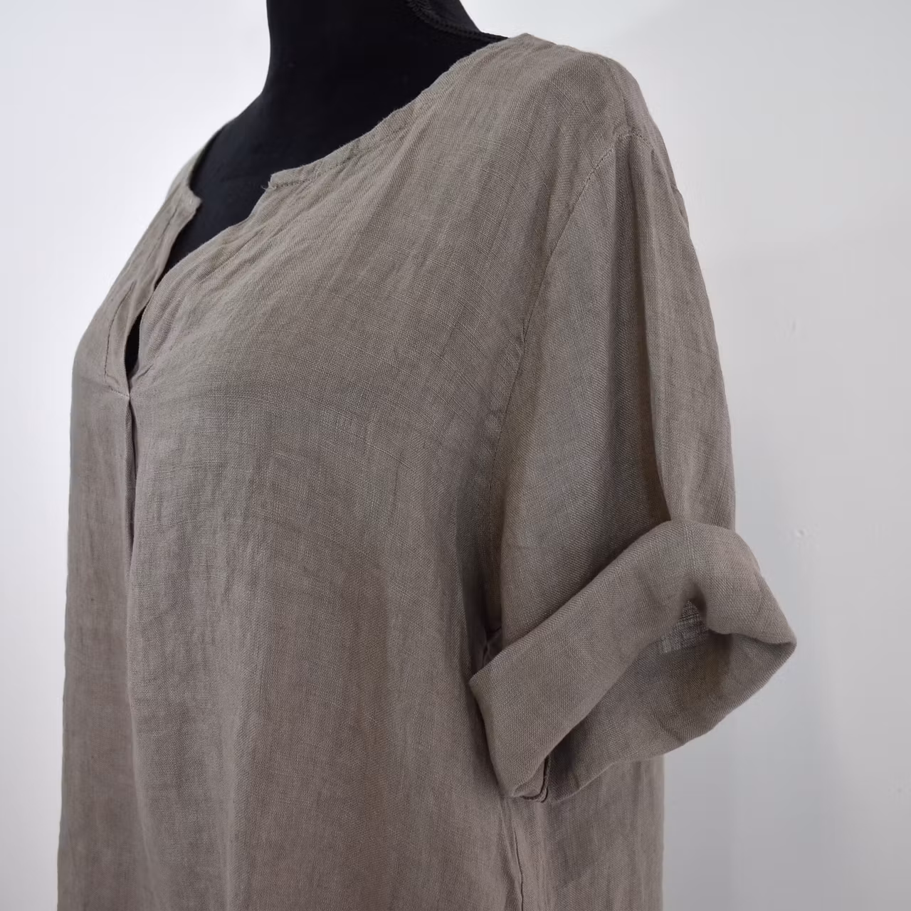 Det här är en enkel och fin v-ringad topp i tunt linnetyg. Ärmen är halvlång och kan vikas upp. På ryggen är där ett dekorativt sprund och toppen är längre baktill. Observera att materialet inte innehåller stretch och att tyget är tunt och något genomskinligt. Observera att förekomsten av streck, färgskiftningar etc. inte är defekter utan en del av det som gör tyget vackert.