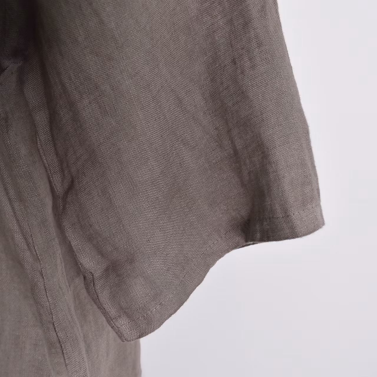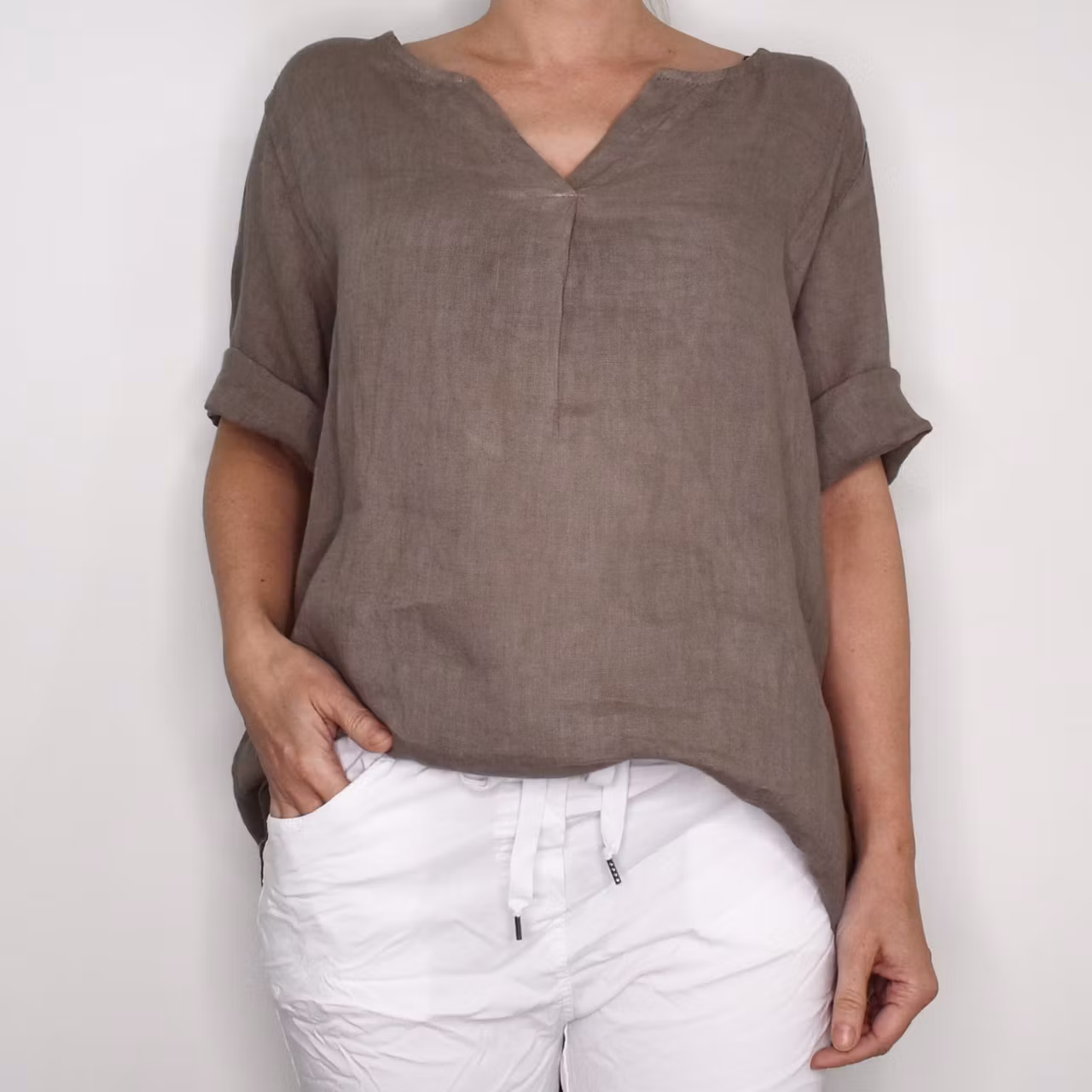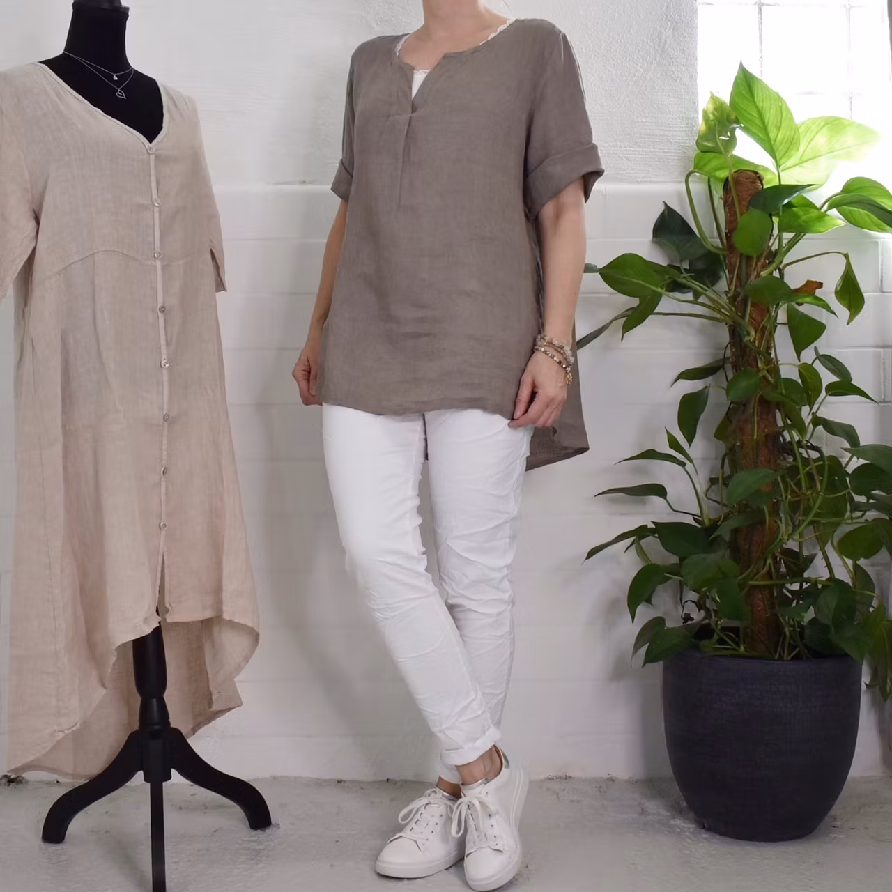 Det här är en enkel och fin v-ringad topp i tunt linnetyg. Ärmen är halvlång och kan vikas upp. På ryggen är där ett dekorativt sprund och toppen är längre baktill. Observera att materialet inte innehåller stretch och att tyget är tunt och något genomskinligt. Observera att förekomsten av streck, färgskiftningar etc. inte är defekter utan en del av det som gör tyget vackert.