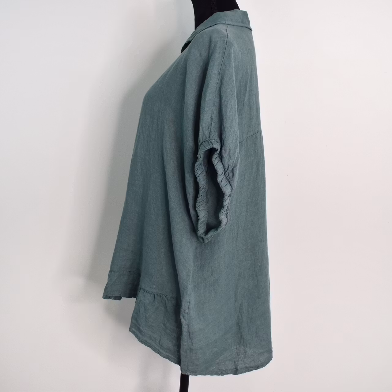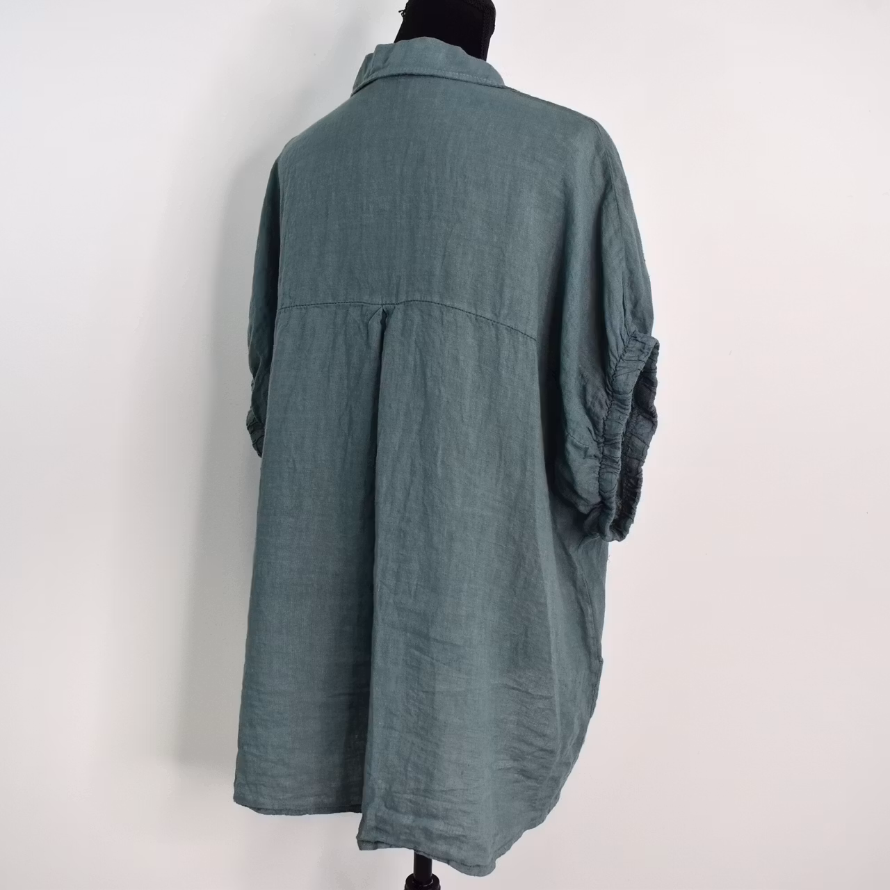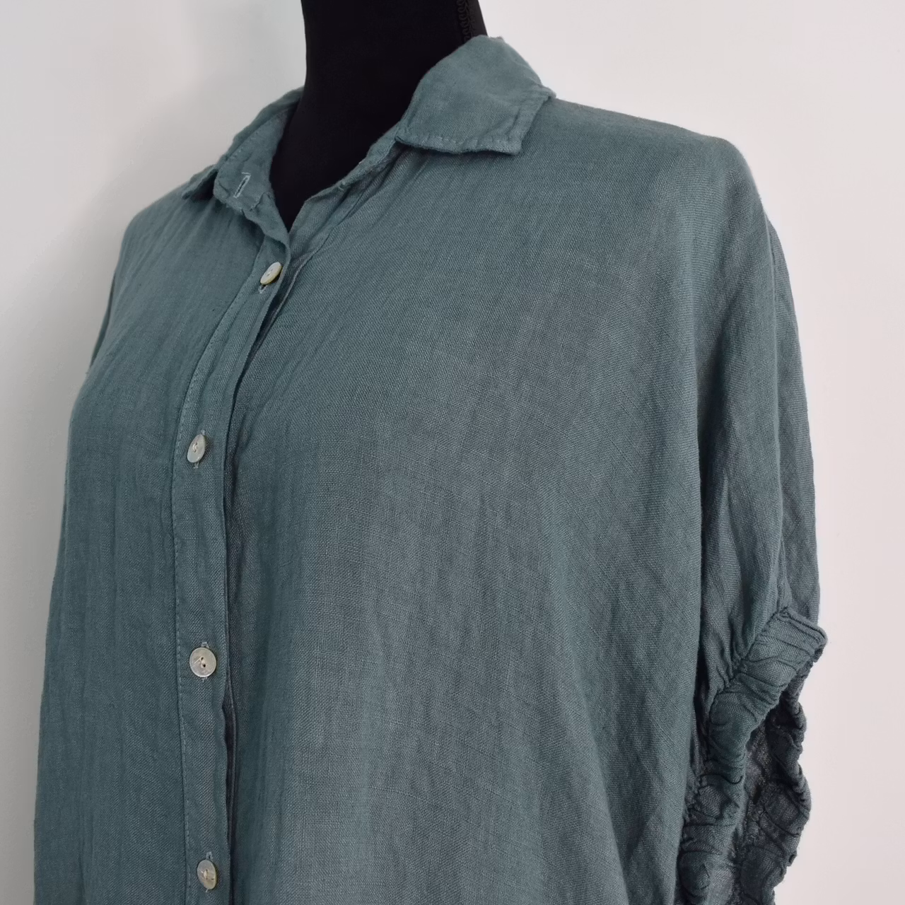 Det här är en snygg linneskjorta med läcker kort, rynkad resår-ärm samt en liten volang längst ner framtill. Där är pärlemorknappar hela vägen fram och skjortan är längre baktill. Under sömmen tvärs över ryggen är där ett dekorativt sprund. Tänk på att materialet inte innehåller stretch och att tyget är något genomskinligt. Rymlig One Size - passar uppskattningsvis upp till storlek 42. Då vi alla är olika formade rekommenderar vi att man tar hjälp av måtten längre ner i beskrivningen nedan för att bedöma om plagget kan passa. Modellen har en bröstvidd på cirka 88cm och är 163cm lång. Observera att förekomsten av streck, färgskiftningar etc. inte är defekter utan en del av det som gör tyget vackert.