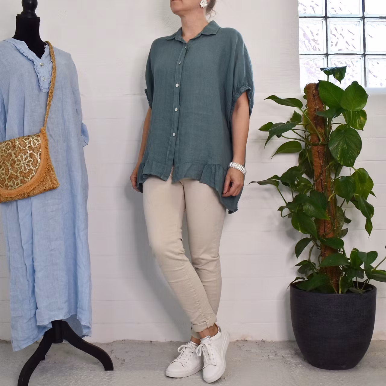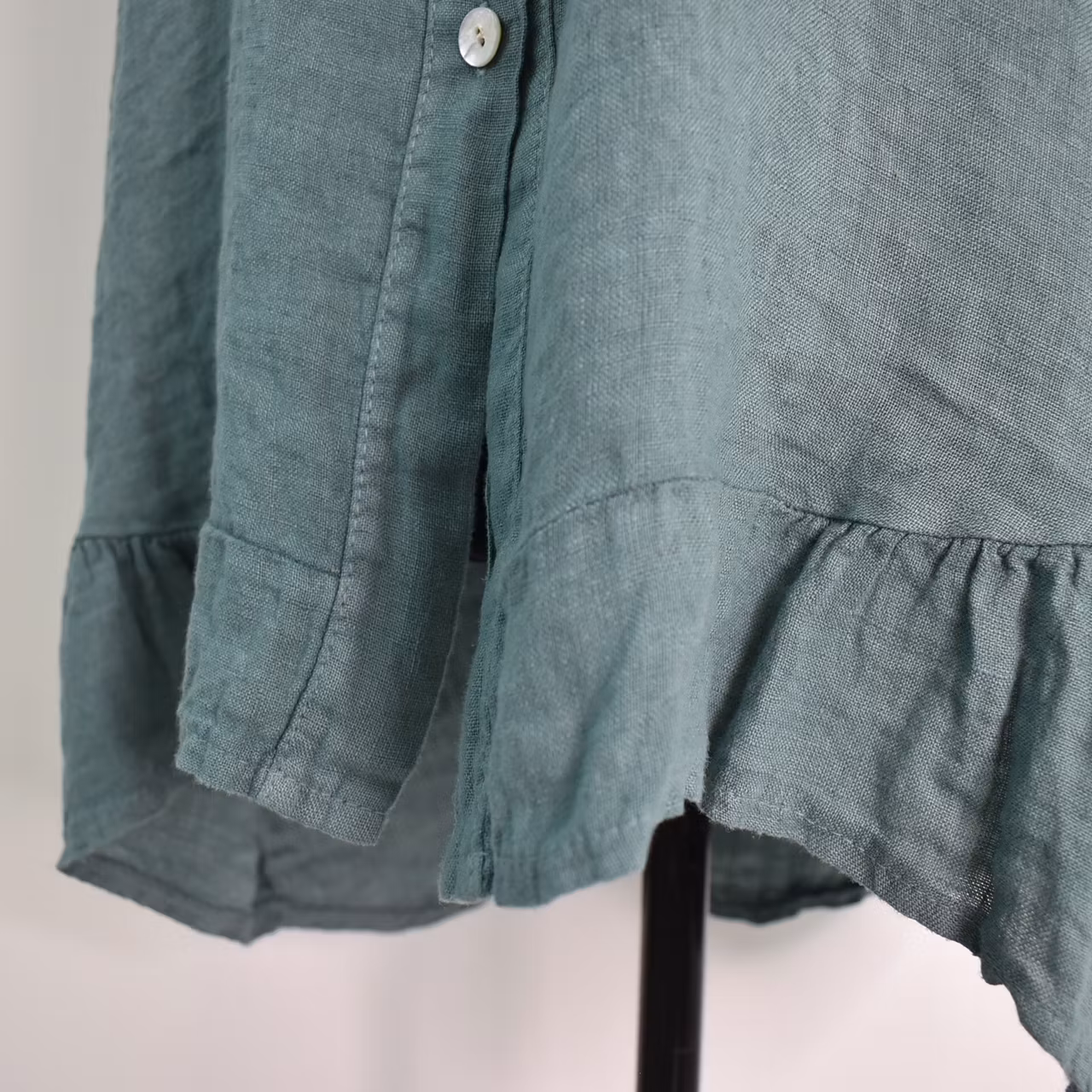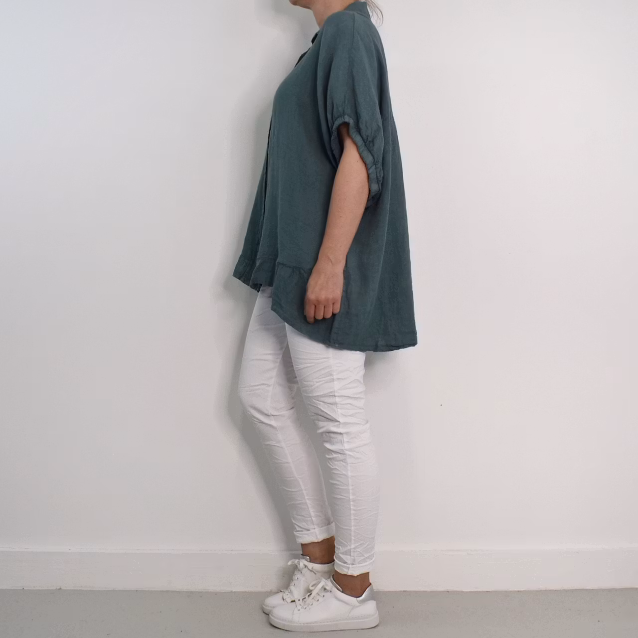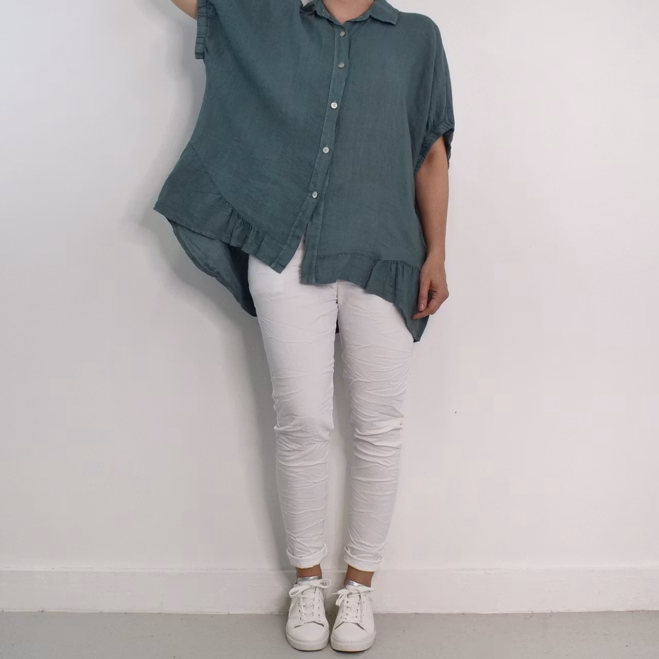 Det här är en snygg linneskjorta med läcker kort, rynkad resår-ärm samt en liten volang längst ner framtill. Där är pärlemorknappar hela vägen fram och skjortan är längre baktill. Under sömmen tvärs över ryggen är där ett dekorativt sprund. Tänk på att materialet inte innehåller stretch och att tyget är något genomskinligt. Rymlig One Size - passar uppskattningsvis upp till storlek 42. Då vi alla är olika formade rekommenderar vi att man tar hjälp av måtten längre ner i beskrivningen nedan för att bedöma om plagget kan passa. Modellen har en bröstvidd på cirka 88cm och är 163cm lång. Observera att förekomsten av streck, färgskiftningar etc. inte är defekter utan en del av det som gör tyget vackert.