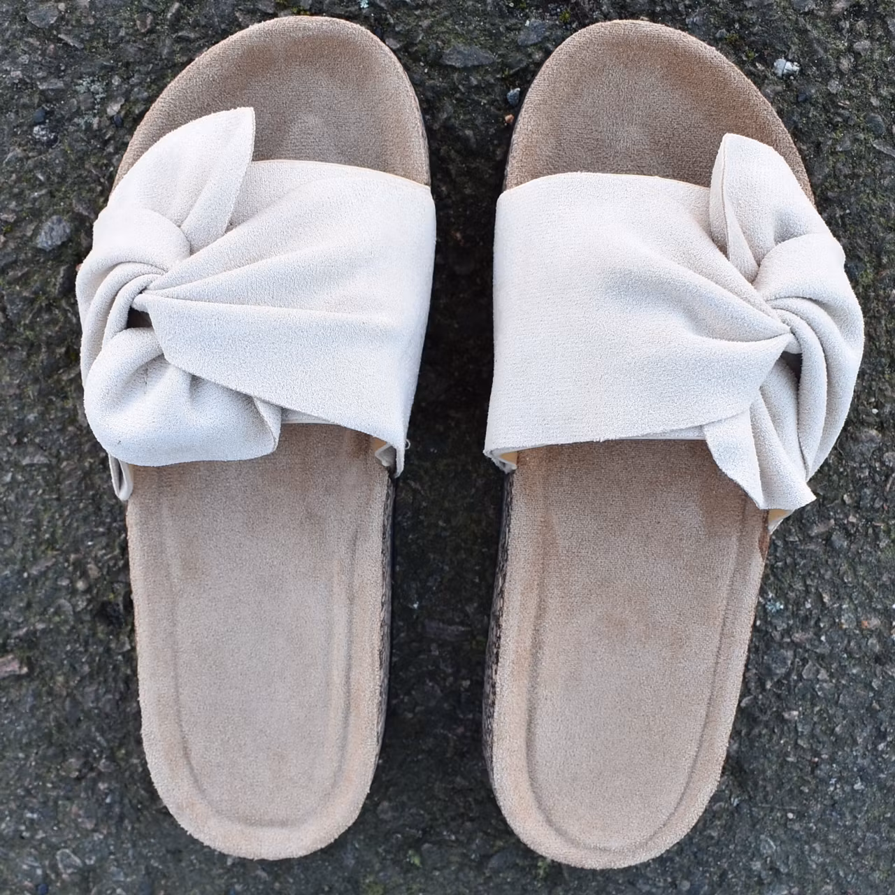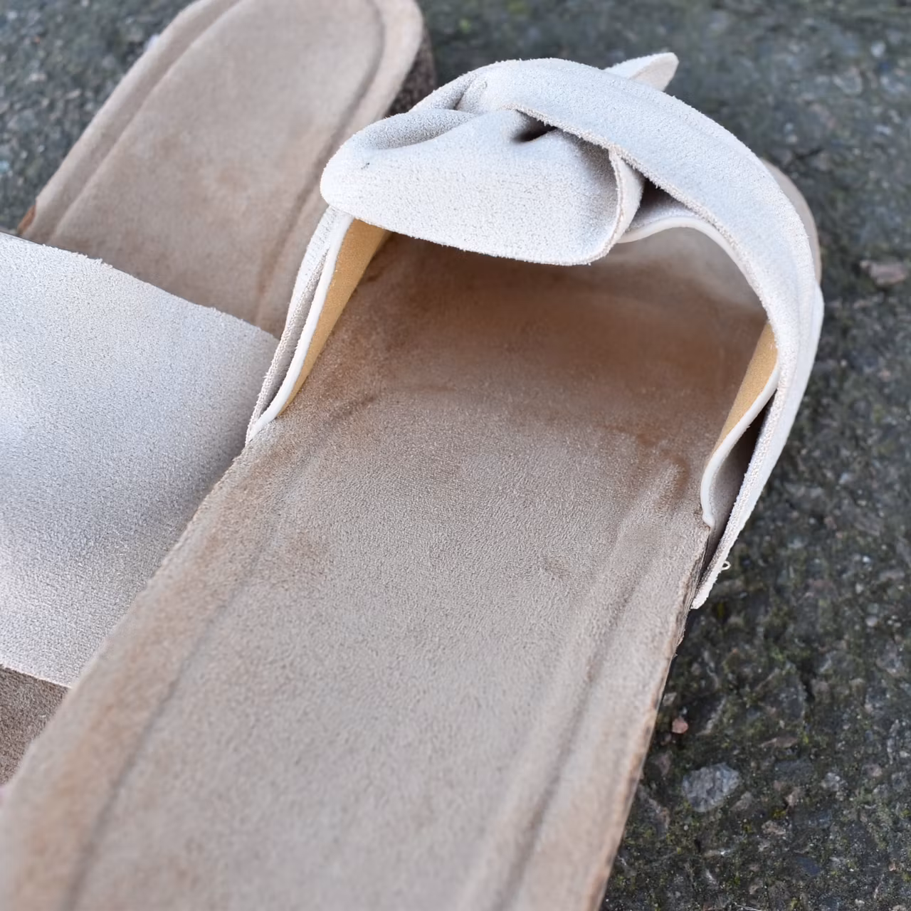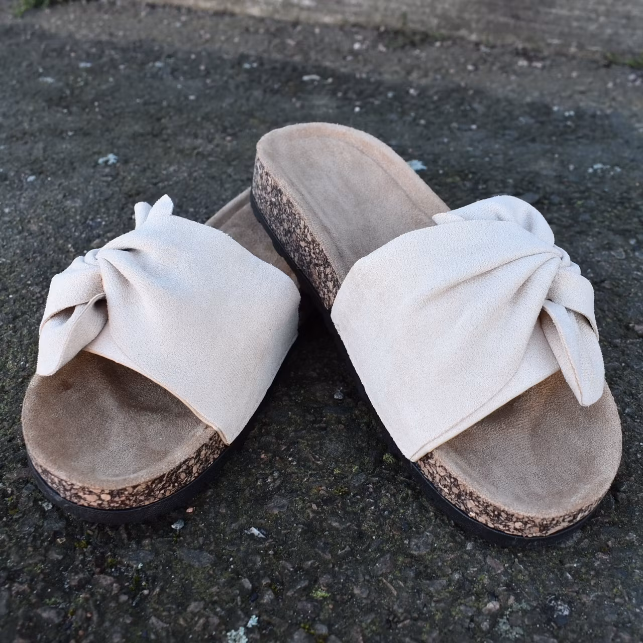 Detta är en ljuvlig sandal med en söt rosett lite på sidan av fotryggen. Sandalen är både fin och bekväm med mjuk innersula som från hålfoten och bak till hälen är lätt fodrad med mjukt skum. Rosetten är i mocca-imitation och tyget är fastsytt över ett extra inlägg för att hålla formen. Sandalen funkar även fint som innesko när de inte kan användas utomhus. Vi upplever dessa som små i storlek men rekommenderar att du mäter din fot innan du beställer. Mått hittar du i beskrivningen längre ner. Finns i storlekar 36-41.