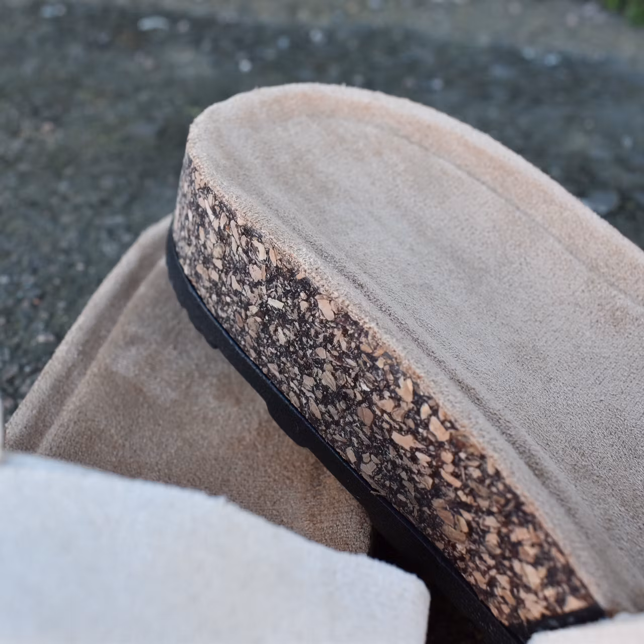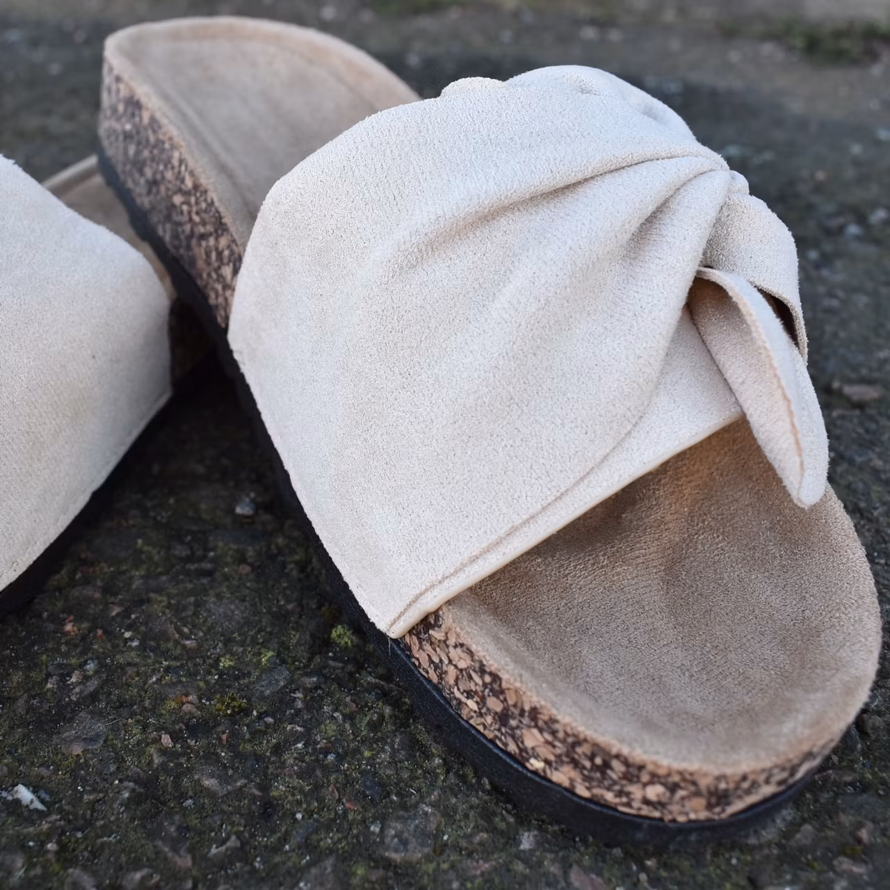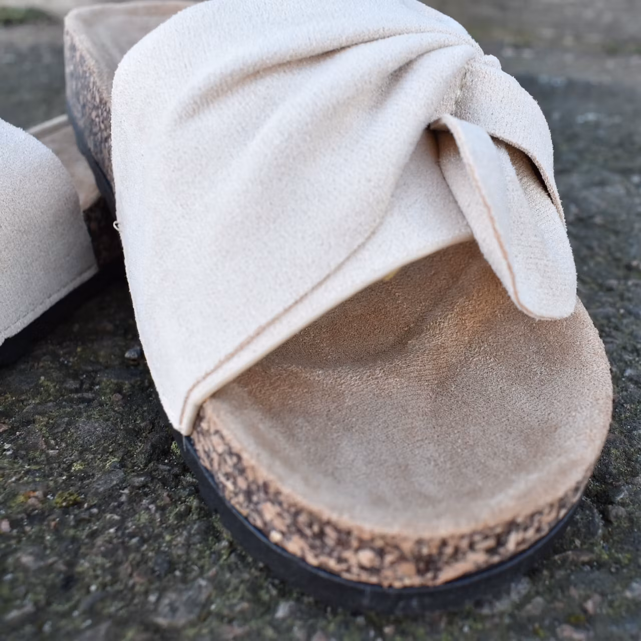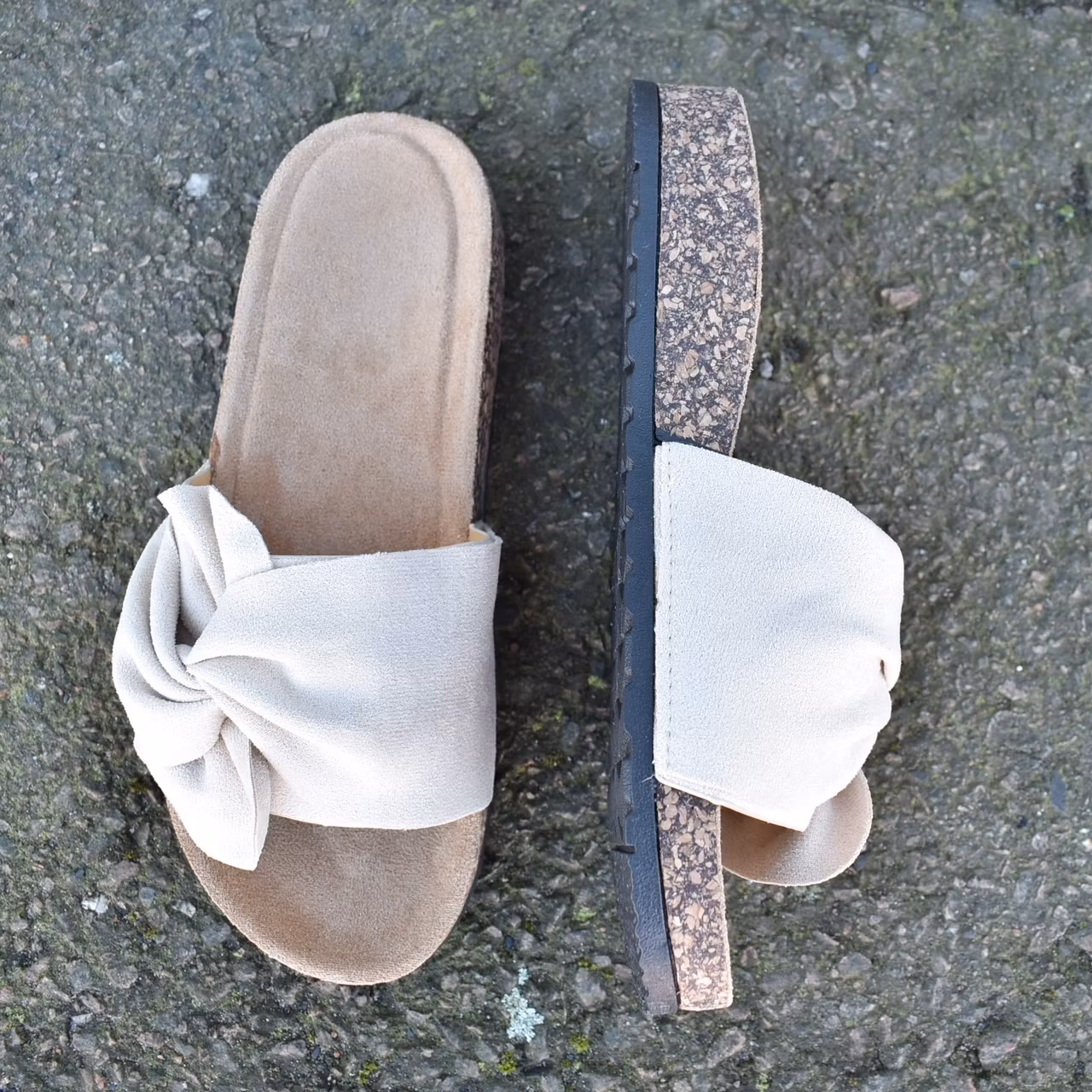 Detta är en ljuvlig sandal med en söt rosett lite på sidan av fotryggen. Sandalen är både fin och bekväm med mjuk innersula som från hålfoten och bak till hälen är lätt fodrad med mjukt skum. Rosetten är i mocca-imitation och tyget är fastsytt över ett extra inlägg för att hålla formen. Sandalen funkar även fint som innesko när de inte kan användas utomhus. Vi upplever dessa som små i storlek men rekommenderar att du mäter din fot innan du beställer. Mått hittar du i beskrivningen längre ner. Finns i storlekar 36-41.